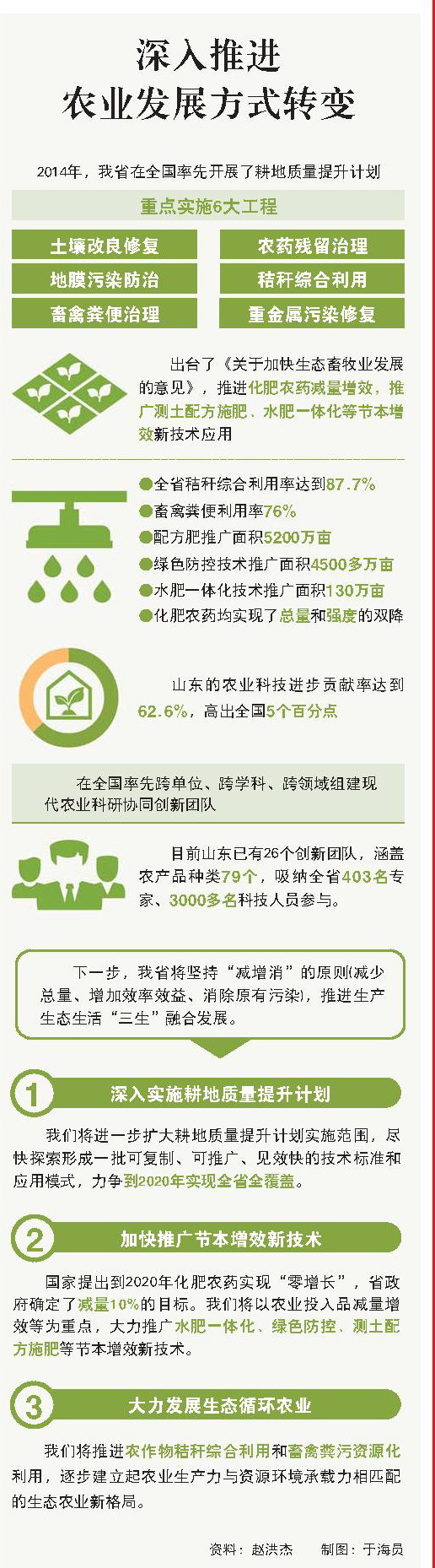 山東以綠色發(fā)展理念為指引,堅持“減增消”的原則(減少總量、增加效率效益、消除原有污染),推進生產(chǎn)生態(tài)生活“三生”融合發(fā)展,植物動物微生物“三物”循環(huán)共生,加快構建生態(tài)修復長效機制。同時創(chuàng)新體制機制整合農(nóng)業(yè)科研人員的力量,讓科研成果寫在大地上。