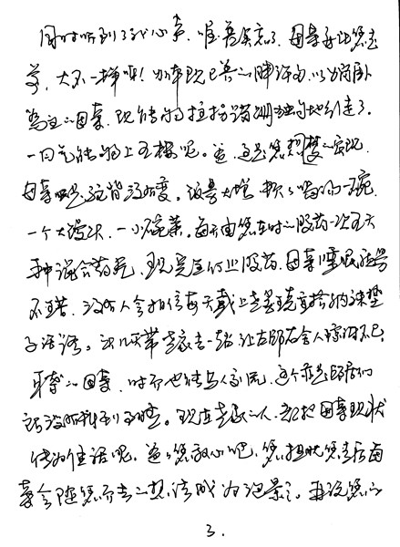 爸爸,您雖然永遠的不能給我寫信了,這個您放心就是了。該我寫信回報給您的時候。爸爸,通往蒼天是有神靈快遞的,我想,在我讀信的同時,您一定同時聽到了我的心聲。喔,差點忘了。母親要比您走前,大不一樣呀!身體現已養的胖許多,以躺臥為主的母親,現能夠拄拐且蹣跚獨自地行走了,一口氣能夠上五樓呢。爸爸,這是您夢想的實現。母親只是駝背沒有變。飯量大增,頓頓喝湯一碗,一個大饅頭,一小碗菜,每一天由您在時的服藥一次五六種混合藥片,現完全停止服藥,母親的睡眠質量不錯。沒有人會相信每天戴上老花鏡重拾納襪墊子活路。頭幾天帶老家去一趟,讓左鄰右舍的人驚訝不已。耳聾的母親,時而也能與人交流。這個亦是鄰居們所沒有料到的事情。現在老家的人,都把母親現狀傳為佳話呢。爸爸您放心吧。您擔憂您走后母親會隨您而去的想法成為泡影。再說您的孫子大學畢業后從事金融工作,一切安好。爸爸,深夜了,我不打擾您了,您也該休息。有話以后再聊!就此擱筆,再見!