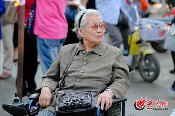6月7日上午上午8:10,在濟南市山東省實驗中學門口站滿了送考的家長。隊伍中,一位頭發花白、坐著電動輪椅的老奶奶吸引了記者的注意。