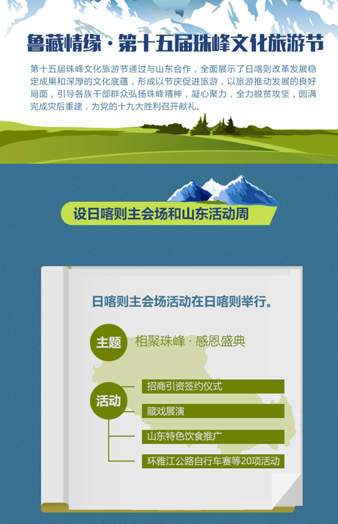 雅江歡歌迎賓客,珠峰承瑞慶盛世。由山東省人民政府,中共日喀則市委、市政府主辦的第十五屆珠峰文化旅游節(jié)今晚在日喀則主會(huì)場(chǎng)上海體育場(chǎng)盛裝開幕。 <詳細(xì)>