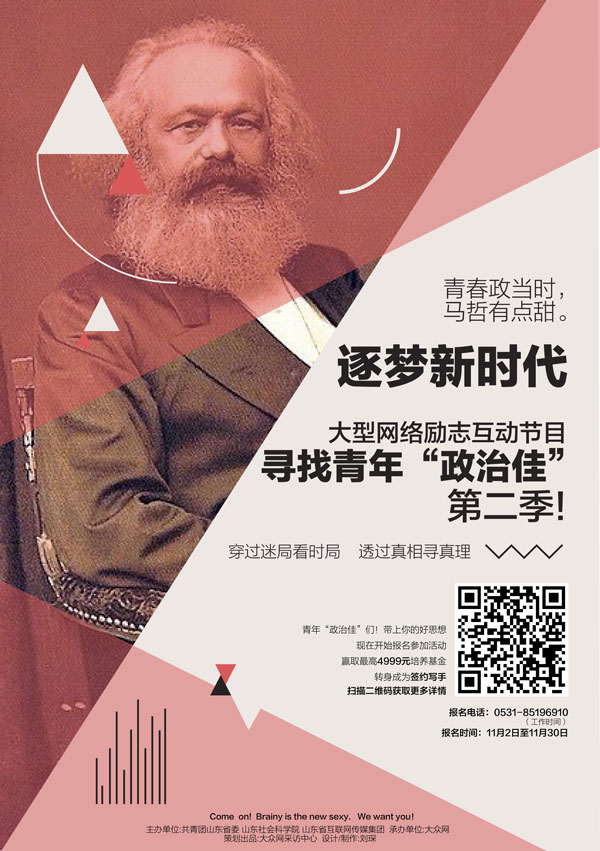 大眾網濟南11月3日訊 習近平總書記在十九大報告中指出,中國夢是我們這一代的,更是青年一代的。如果你滿懷青春夢想,請一定不要錯過這個舞臺!即日起,逐夢新時代--尋找青年“政治佳”(第二季)活動正式開始報名,活動圍繞進一步學習宣傳貫徹落實十九大精神設計了多個選題,參賽者可創作理論文章、H5、手繪、動漫、微電影、快閃等各種適合互聯網傳播的正能量作品,“花樣”詮釋你心目中的十九大精神,放飛青春夢想。