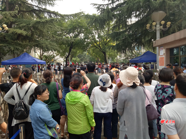 大眾網煙臺6月8日訊 (記者 屈晨晨 見習記者 邢莉莎) 6月8日,2018夏季高考第二天,上午8點20分,在煙臺一中考點,為了給考生們加油打氣,很多家長和老師自覺站在過道兩邊,目送考生有序進入考場。