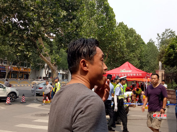 而今天濟南的風力不小,開考前標志牌曾被大風掀翻,考慮到這一點,考生家長馬先生不到3點就站在標志牌前,單手扶住牌子,“擔心牌子倒了,過往車輛看不到,想為孩子們營造個安靜的環境。”