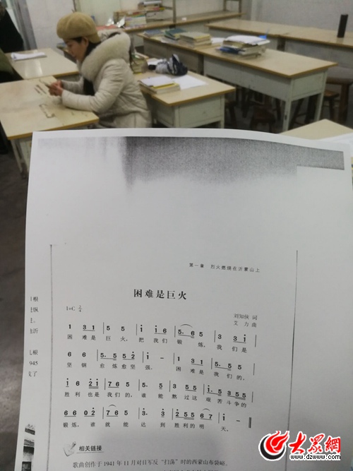 大眾網(wǎng)臨沂12月3日訊 抗日戰(zhàn)爭最艱苦時期,在沂蒙山區(qū)和根據(jù)地干部中流傳著一首紅歌。曾親身經(jīng)歷過抗日戰(zhàn)爭的大眾日報社原總編輯辛冠潔將這首歌稱為“能代表大眾日報精神的一首歌”,能讓他想起烽火歲月,極大鼓舞了軍民的士氣。但辛老和大眾日報社同志只知道歌曲的片段,不知道完整的歌詞和曲譜,連歌名和作者都不知道。辛老在大眾日報報史館館長于岸青文章中看到歌詞片段,勾起深情回憶,就委托于岸青發(fā)掘這首歌。直到于岸青找到沂南的秦丕山老師,這首歌才在及歷史煙塵中再度展現(xiàn)清晰、完整的容顏。這首歌就是《困難是巨火》。