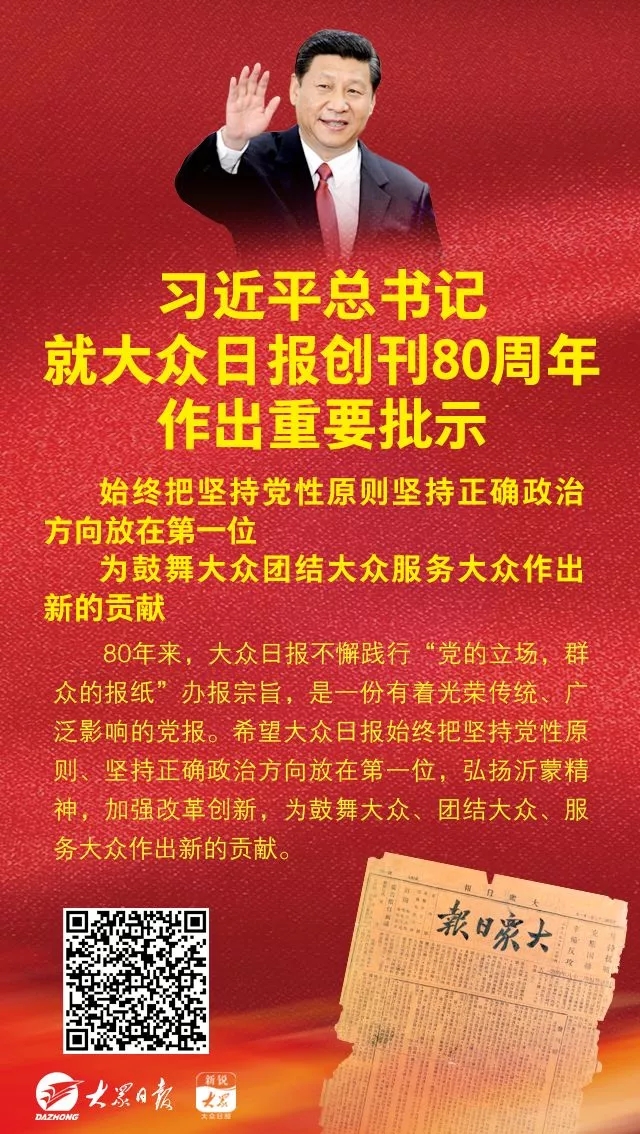 80年來,大眾日?qǐng)?bào)不懈踐行“黨的立場(chǎng),群眾的報(bào)紙”辦報(bào)宗旨,是一份有著光榮傳統(tǒng)、廣泛影響的黨報(bào)。希望大眾日?qǐng)?bào)始終把堅(jiān)持黨性原則、堅(jiān)持正確政治方向放在第一位,弘揚(yáng)沂蒙精神,加強(qiáng)改革創(chuàng)新,為鼓舞大眾、團(tuán)結(jié)大眾、服務(wù)大眾作出新的貢獻(xiàn)。