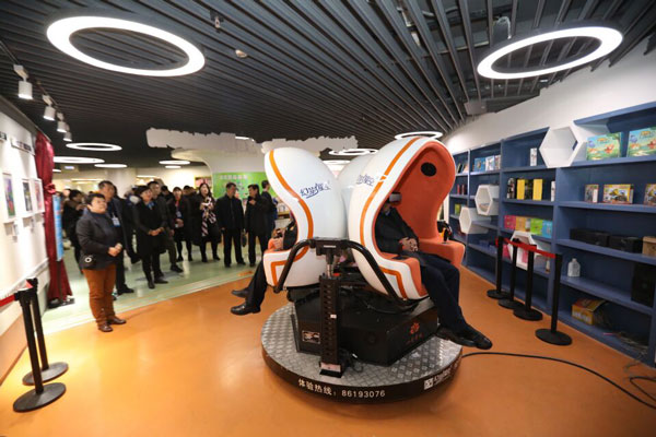 “第十三屆中國網絡媒體山東行”采訪團記者體驗書城中的動感電影。