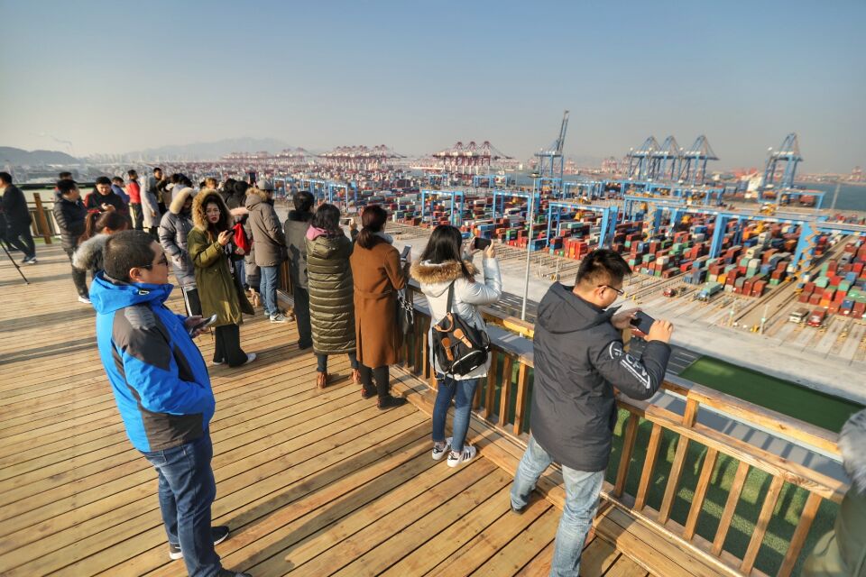 采訪團(tuán)參觀青島港自動(dòng)化碼頭。