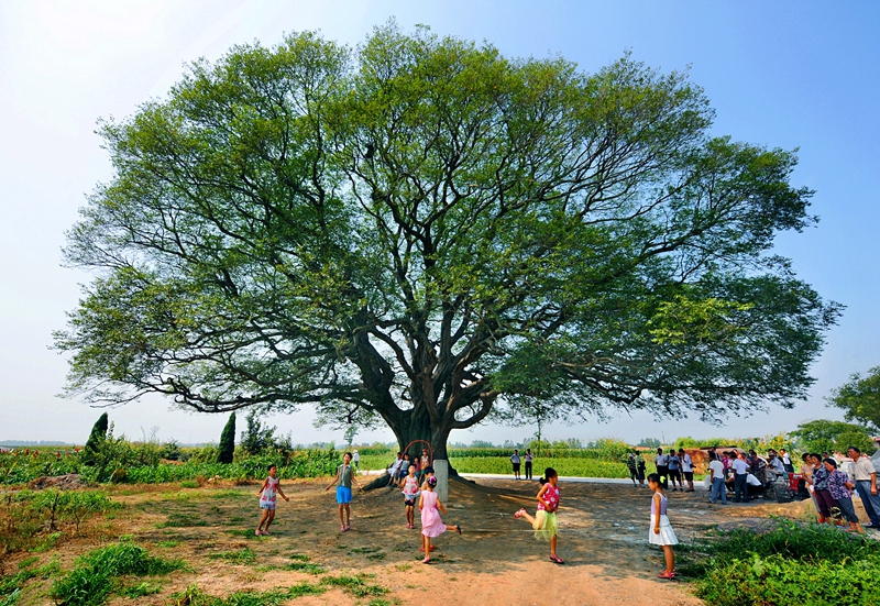 2011年7月,萊西三都河村,一棵有碑文記載乾隆年間的古樹(shù)生機(jī)勃勃,樹(shù)陰下的人們歡聲笑語(yǔ),同學(xué)少年跳繩健身。大樹(shù)底下好乘涼,樹(shù)冠龐大的古樹(shù)見(jiàn)證著村民幸福和美的生活。