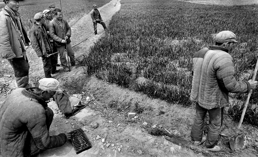 記者注意到,本次參展的攝影家們拿出了“壓箱底”的作品,許多此前從未公開展出過。其中,有一幅照片拍攝的是站在田間的八位農(nóng)民,圖中一位農(nóng)民手拿算盤蹲在地上,另一位農(nóng)民拿著鐵鍬站在田地中,似乎在思考著什么,大家身上穿得破舊,但臉上帶著笑意。這是山東攝影家李百軍1981年的作品《分田到戶》。它記錄的是,改革開放初期,茌平縣楊莊生產(chǎn)隊丈量土地,分田到戶的歷史瞬間。作品中積極分田到戶的楊莊,也被稱為山東的“小崗村”。