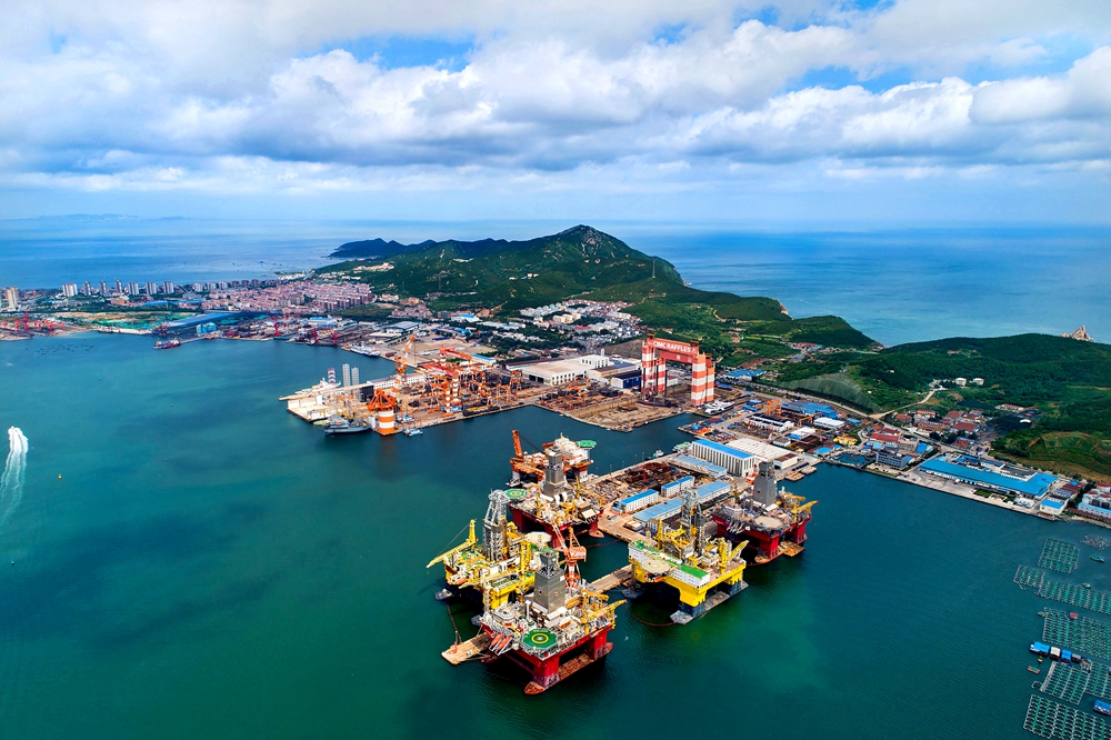 《大國重器 煙臺制造》藍鯨海洋鉆井平臺依山傍水,氣勢磅礴,是促進山東新舊動能轉換的重要實踐。