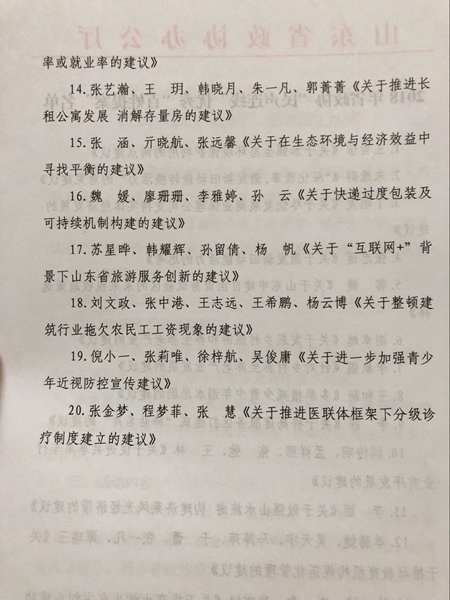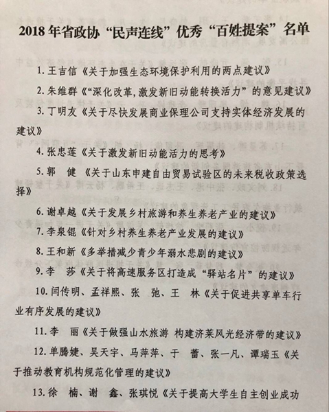 大眾網-海報新聞濟南12月13日訊(記者 樊思思)12月13日,山東省政協舉行2018年“民聲連線”優秀“百姓提案”表彰活動,根據評選結果,共有20件提案上榜,獲評優秀“百姓提案”。同時,省政協十二屆二次會議“民聲連線”活動即日起正式啟動。