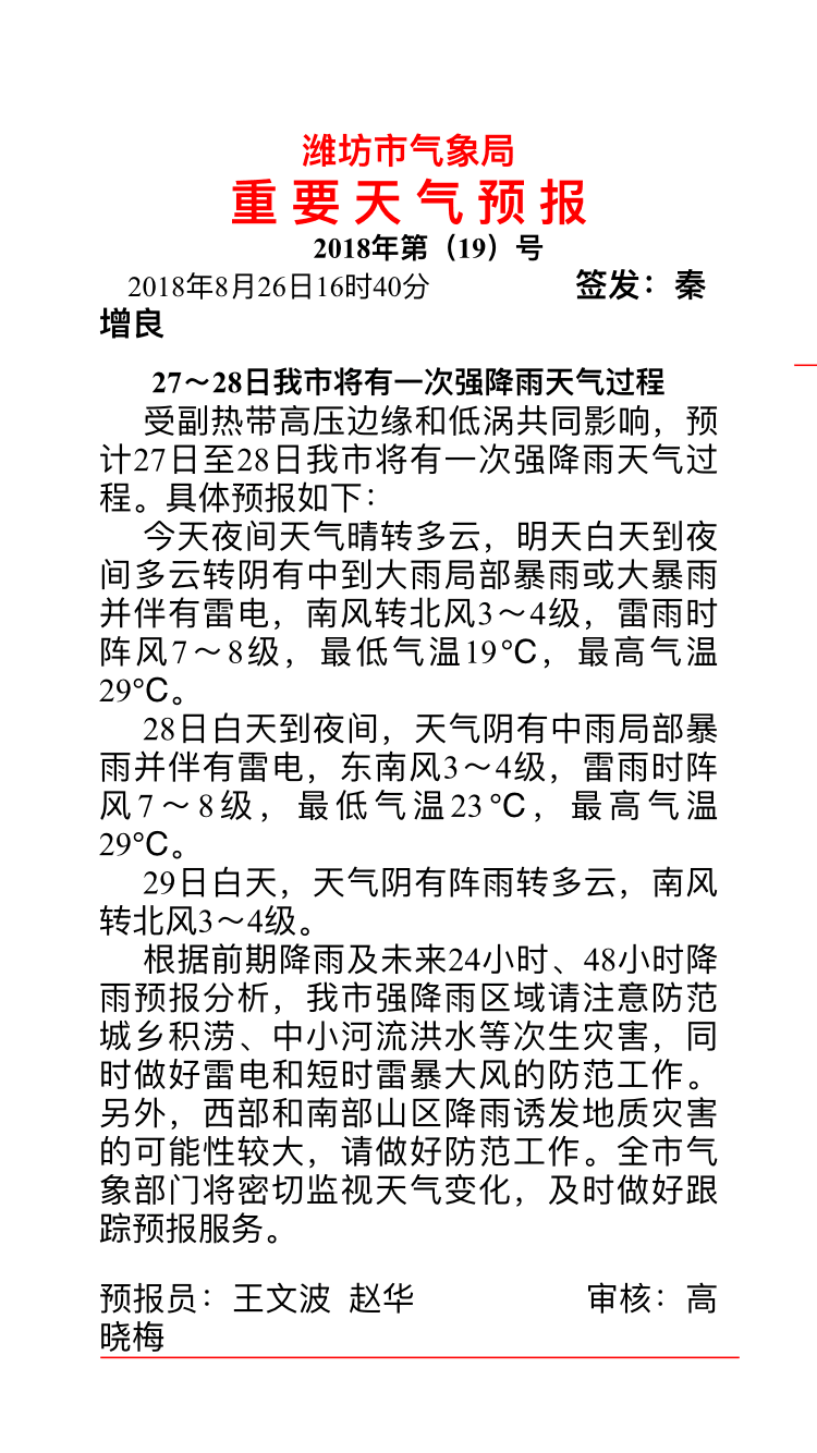 根據(jù)前期降雨及未來(lái)24小時(shí)、48小時(shí)降雨預(yù)報(bào)分析,濰坊市強(qiáng)降雨區(qū)域請(qǐng)注意防范城鄉(xiāng)積澇、中小河流洪水等次生災(zāi)害,同時(shí)做好雷電和短時(shí)雷暴大風(fēng)的防范工作。另外,西部和南部山區(qū)降雨誘發(fā)地質(zhì)災(zāi)害的可能性較大,請(qǐng)做好防范工作。全市氣象部門將密切監(jiān)視天氣變化,及時(shí)做好跟蹤預(yù)報(bào)服務(wù)。
