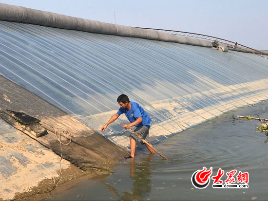 隨后,記者途徑308國道東方村路段時,為給大棚抽水,一名消防戰士怕抽水口堵塞,跳到水坑中徒手清理抽水口的雜草和垃圾,另一名戰士在水坑旁邊緊張關注,以備救援。這兩名戰士均來自青島消防,在這里搶險救災已兩天兩夜。