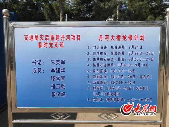 為保質(zhì)保量盡快完成搶修任務(wù),昌樂縣交通運輸局黨委決定成立丹河大橋災(zāi)后重建臨時黨支部,充分發(fā)揮基層黨組織的戰(zhàn)斗堡壘作用和黨員的先鋒模范作用。施工單位倒排工期,掛圖作戰(zhàn),加班加點,晝夜連續(xù)施工,力爭30天內(nèi)恢復(fù)通車,方便廣大群眾出行。
