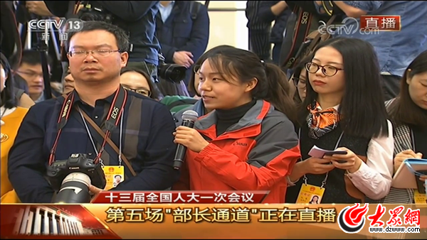 大眾網(wǎng)、山東手機(jī)報(bào)記者樊思思在“部長(zhǎng)通道”提問(wèn)。