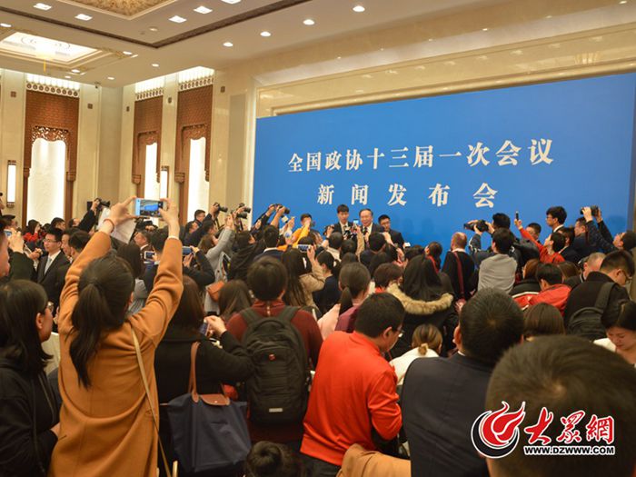2日下午,全國政協十三屆一次會議新聞發布會在人民大會堂舉行,現場長槍短炮林立。(特派記者 趙洪棟)
