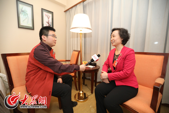 大眾網(wǎng)記者采訪全國(guó)人大代表、山東省水利廳副廳長(zhǎng)曹金萍。(亓翔 攝)
