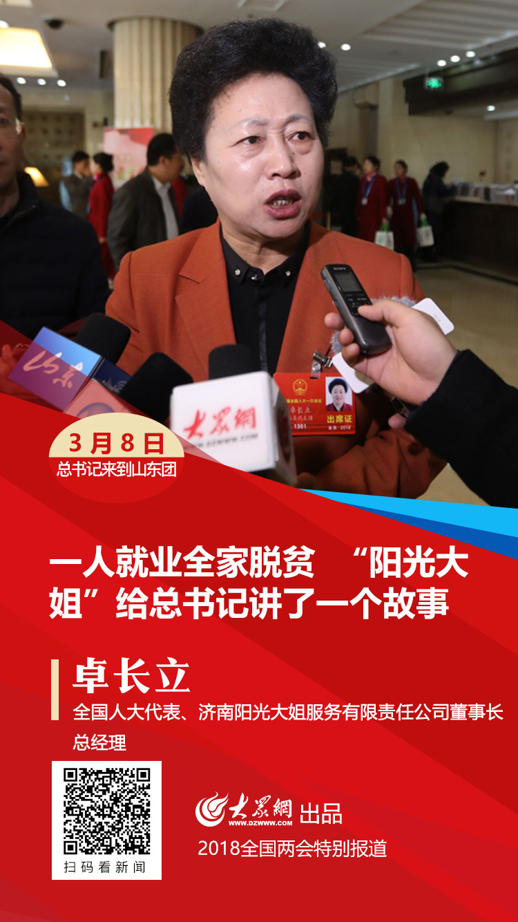全國人大代表、濟(jì)南陽光大姐服務(wù)有限責(zé)任公司董事長兼總經(jīng)理卓長立。