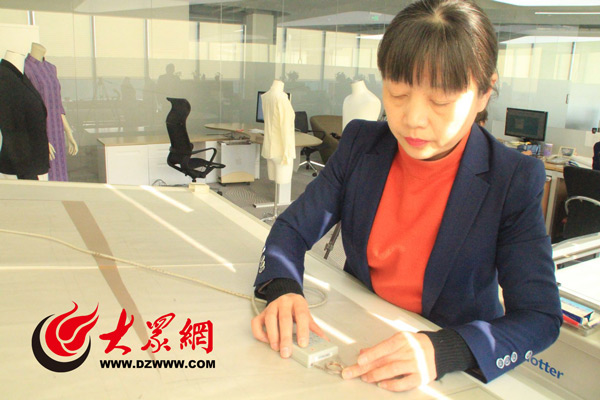 林麗在用制圖機進行服裝設計。