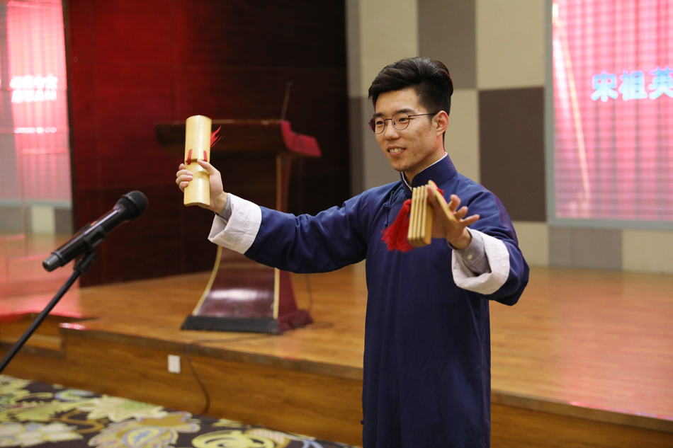 大眾網記者在晚餐時為大家表演山東快書助興。