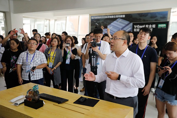 新明輝安全科技有限公司總經理李輝向采訪團介紹公司運營情況。