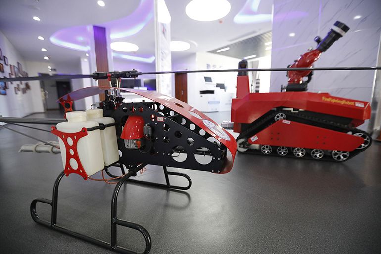 浙大山東工研院展廳中展出的特種無人機(jī)及機(jī)器人。