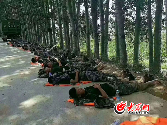 8月25日上午,在受災(zāi)較重的羊口鎮(zhèn)大宅科村附近,連續(xù)六天參與搶險(xiǎn)救災(zāi)的消防官兵在路邊休息。