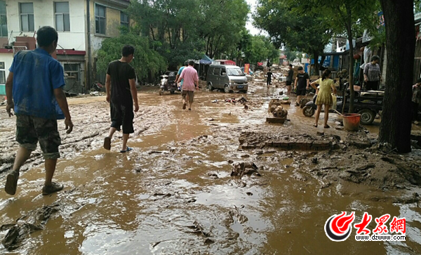 20日上午,大眾網記者趕赴青州市王墳鎮西股村現場途中,路過青州市王墳鎮大峪口村村口,發現這里依然水勢洶涌