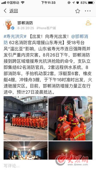 另外,大眾網記者從“南京消防”“揚州發布”“河北交通廣播”“邯鄲消防”等多個官方微博帳號搜索發現,目前江蘇和河北等臨近省份的大批消防官兵正向壽光集結,預計27日凌晨陸續到達。目前,截至8月26日晚22時許,來自濟南消防、聊城消防、青島消防、德州消防、濰坊消防、棗莊消防等的增援官兵陸續抵達壽光,在壽光市蔬菜科技博覽園集結,部分消防車輛完成集結后直奔前線,連夜展開救援。