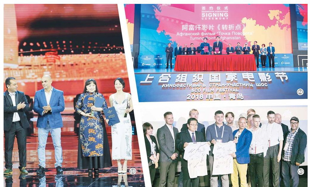圖①:蒙古國(guó)演員歐東奇梅格·阿西多(右二)和中國(guó)演員周迅(右一)獲得首屆上合組織國(guó)家電影節(jié)“金海鷗獎(jiǎng)”最佳女演員。圖②:中國(guó)電影集團(tuán)公司與阿富汗影片《轉(zhuǎn)折點(diǎn)》簽訂意向書(shū)。圖③:俄羅斯電影人和簽名T恤一起合影留念,該T恤將保存在青島電影博物館。 □記者 薄克國(guó) 報(bào)道