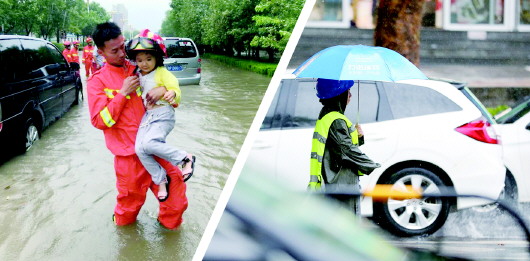 左圖:聊城消防隊(duì)員抱著一名兒童穿越積水馬路。(大眾報(bào)業(yè)記者 郭慶文 報(bào)道) 右圖:濟(jì)南市政工作人員冒雨引導(dǎo)車輛繞開(kāi)施工路段。(記者 王世翔 報(bào)道)