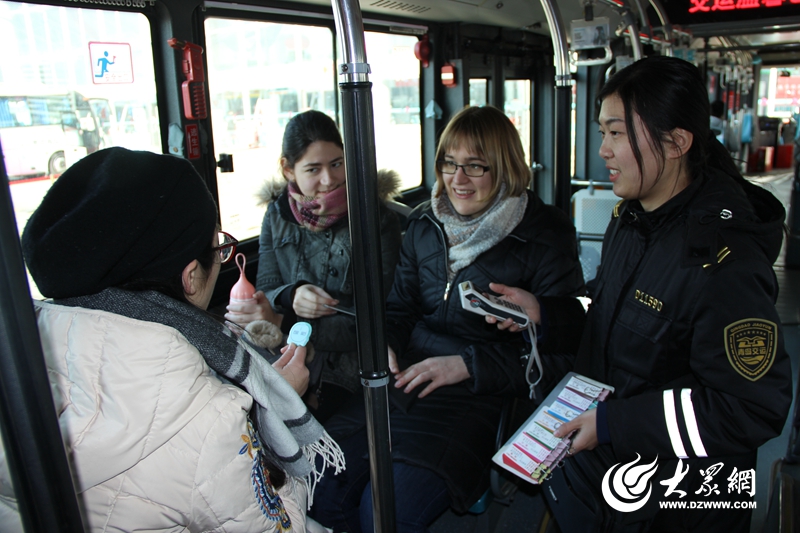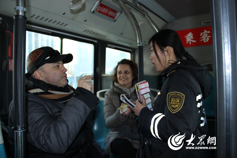 說話間,車輛行駛至海大嶗山校區時,上來了幾個外國乘客,劉雪趕緊走上前用簡單的口語進行交流,得知對方想去泡溫泉,劉雪推薦他們在海泉灣下車。“能給乘客當個導游,我很開心。”劉雪笑著說道。