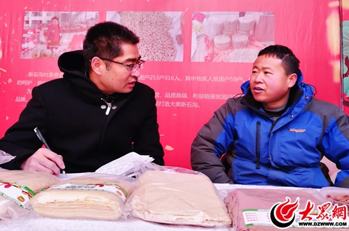 張云超(右)接受大眾網記者采訪,他將自己生產的雜糧煎餅、小米、花生等綠色產品帶到了市區的年貨大集上展銷
