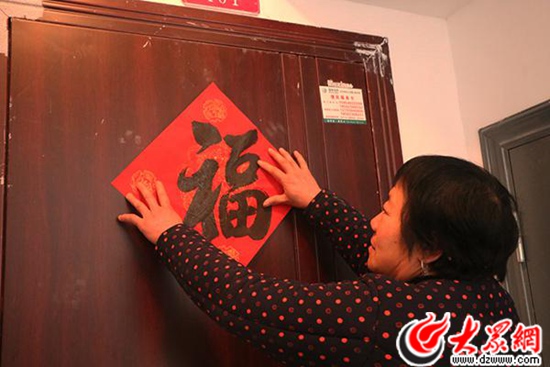 王秀在比劃著怎么貼春聯(王培松 攝)