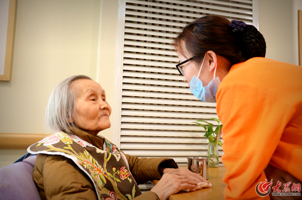 楊冉喜歡陪老人聊天,盡管有時她也聽不懂老人的話,卻始終保持微笑,回應老人的每一句話。她給面前的這位老人起了個昵稱“小可愛”。(大眾網記者 張瑪睿 攝)