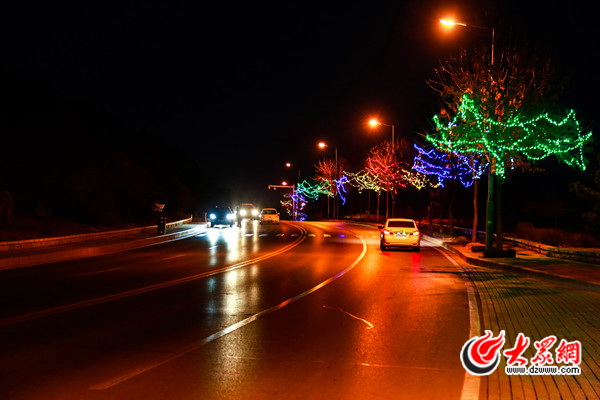 圖為泮河公園北面的新靈山大街,這條道路一直往西就是泰安高鐵站。現在整條道路都被燈光點綴,紅色燈籠和絢麗的燈光交融在一起,營造出一種節日的喜慶氛圍。