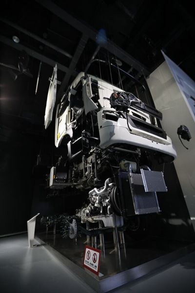 欣賞完了我國重型汽車界的“祖師級”汽車,一路看下去,重汽的發展仿佛坐上了高速列車,展示的產品和技術也越來越先進。HOWO、斯太爾、黃河、威濼……一系列成功引進和自主研發的品牌,使重汽成為國內卡車行業驅動形式和功率覆蓋最全的企業。在HOWO-T7H實體車拆解展示臺前,巨大的卡車被拆解成上百個部分進行立體展示,對重型汽車感興趣的記者們可謂過足了癮,不停地尋找角度拍攝照片和小視頻。轉過一個彎,眼前一輛黃色的汕德卡重型汽車吸引了大家的目光,工作人員告訴記者,這是重汽集團目前最先進的車型之一,能實現連續行駛150萬公里無大修。幾位記者爬進高大的駕駛室,連連感嘆“比房車還寬敞舒適”。在發動機核心技術展示區,工作人員利用滑動透明屏展示了國產化曼技術發動機的工作原理,這是中國重汽在發動機領域的核心成果,精密的設計引來一片贊嘆。