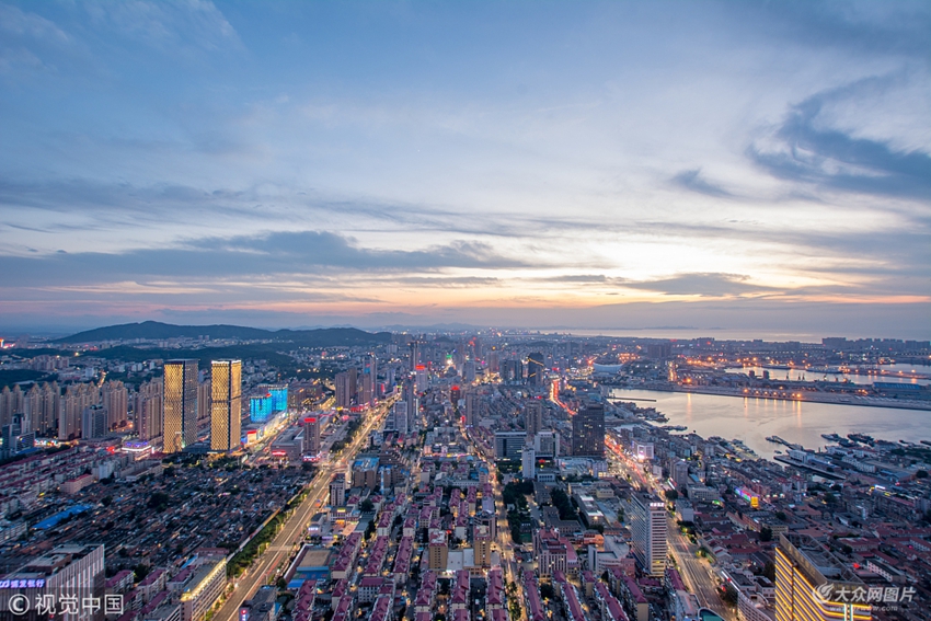 2018年7月7日,山東煙臺(tái),晚上華燈初上,落日余暉下的煙臺(tái)美成了童話世界。登高遠(yuǎn)眺,大海、霓虹扮靚的高樓大廈盡收眼底,美不勝收。