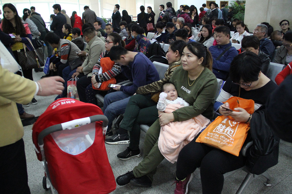 由于限制本地戶口一個家庭限制兩套房,一婦女抱著幾個月的嬰兒在排隊買房。陳寧 攝