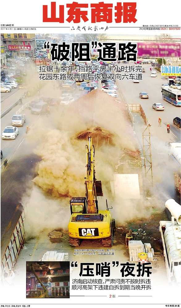 拉鋸十余年,擋路平房半小時拆完,花園東路或兩周恢復(fù)雙向六車道。 山東商報 趙天羿
