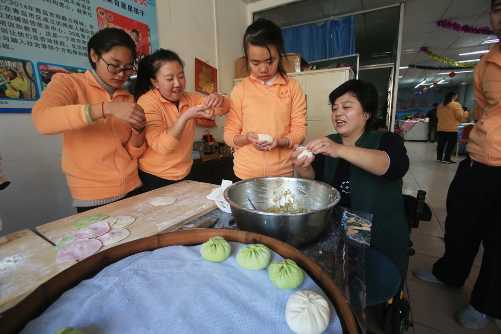 2017年12月5日,記者見到了55歲的楊萍和她的“蝸牛”們。楊萍是一名患小兒麻痹癥的殘疾人,被稱為坐在輪椅上為阿瑪尼打版的“青島最牛裁縫”。2014年4月,事業有聲有色的楊萍在青島率先成立了首家具有公益性、庇護性、非營利性等特點的社會服務機構——同沐陽光殘疾人輔助性就業中心,目前安置了34名18歲到42歲的智力殘疾人,而這些特殊青年“孩子”稱楊萍為“楊媽媽”。
