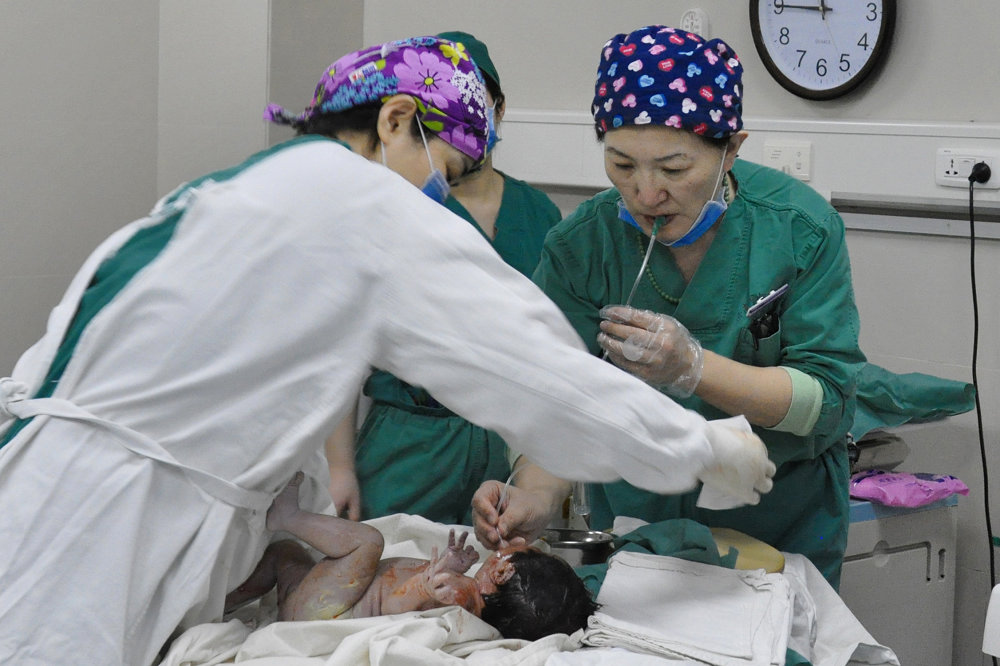 王翔正在將新生兒口中的羊水吸出來。新生兒口中的羊水如果不及時吸出,會發生危險。每遇這種情況,醫護人員就會毫不猶豫地采取各種措施。