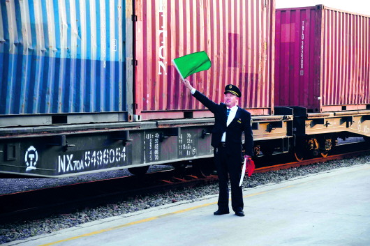 □新華社發 5月7日,中亞(青島)國際班列在值班站長旗語指揮下緩緩開行。