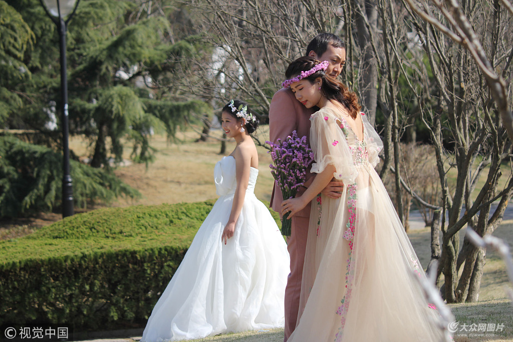 2018年4月8日,新人在青島海濱拍攝婚紗照。氣溫回暖春光明媚,青島海濱匯泉廣場、百花苑的連翹、玉蘭、櫻花等花兒怒放,吸引大批新人扎堆熱拍婚紗照,不負春光不負卿,為人生花樣年華留下美麗瞬間。