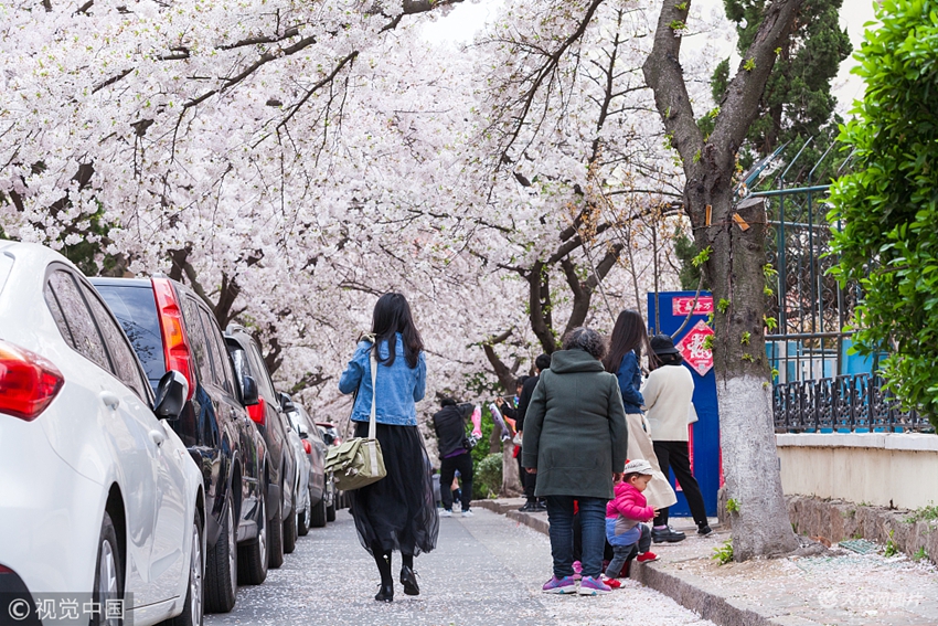2018年4月14日,青島。三明南路因櫻花樹眾多聞名,被譽為“青島最美櫻花路”,每到櫻花季櫻花盛開都會吸引大量市民前來拍照留念。