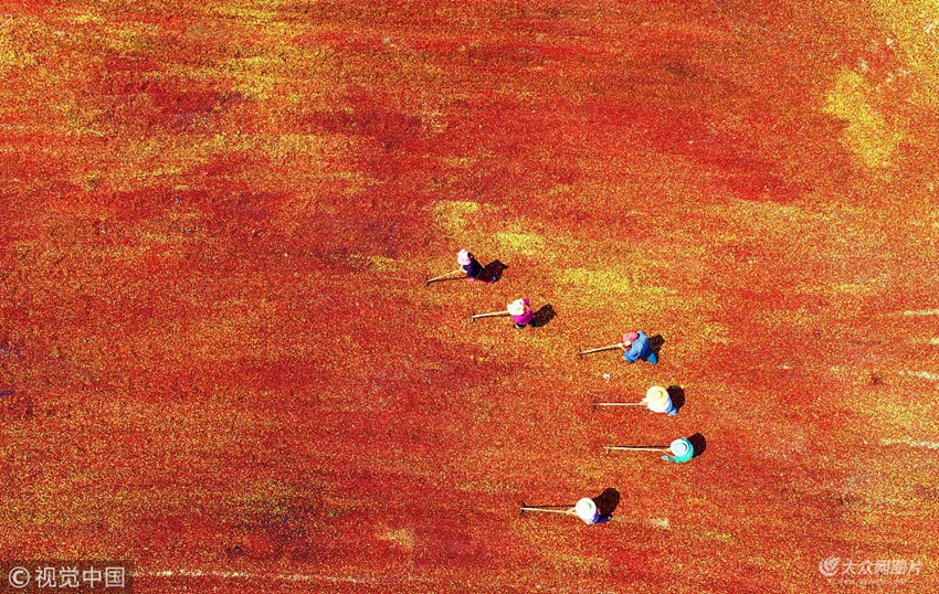 2018年9月6日,山東臨沂,航拍沂南縣玉山中藥材種植專業合作社員工在晾曬酸棗。