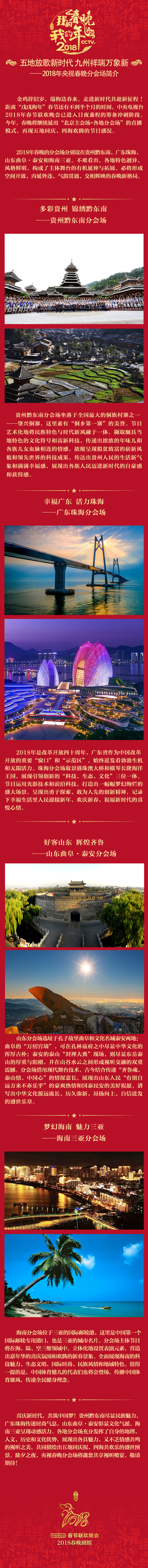 央視網消息:金雞辭舊歲,瑞狗送春來。走進新時代,共赴新征程!距離“戊戌狗年”春節還有不足半個月的時間,中央電視臺2018年春節聯歡晚會已進入日夜兼程的籌備沖刺階段。今年,春晚將繼續延用“北京主會場+各地分會場”的直播模式,再現五地同慶、四海歡騰的節日盛況。