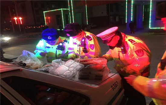 負責春晚分會場現場交通執勤的泰安交警們的“年夜飯”