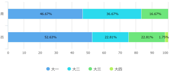 在關(guān)于“您認(rèn)為大學(xué)生有必要關(guān)注政治嗎”的問題中,認(rèn)為非常有必要的學(xué)生文史類占56.76%,理工類占36.04%,其他專業(yè)占7.21%,沒有同學(xué)認(rèn)為沒必要關(guān)注政治。在關(guān)于“你希望自己為國家建言獻(xiàn)策嗎”的問題中,非常希望的同學(xué)中文史類占到63.64%,理工類占33.33%,其他專業(yè)占3.03%,沒有同學(xué)不希望為國家建言獻(xiàn)策。同樣是這兩個問題,就學(xué)業(yè)階段來看,大一的同學(xué)在各個標(biāo)準(zhǔn)下占比人數(shù)均是最多的。其他各專業(yè)比例較為平均。結(jié)合其他問卷問題結(jié)果可以看出,當(dāng)代大學(xué)生擁有一個較為積極的政治參與態(tài)度,愿意盡自己所能進(jìn)行一定的政治參與,同時文史類同學(xué)以及大一同學(xué)更加具有飽滿的政治參與態(tài)度,相比而言其他專業(yè)和學(xué)業(yè)階段的同學(xué)態(tài)度積極性不足。可以看出假設(shè)1具有一定的合理性。