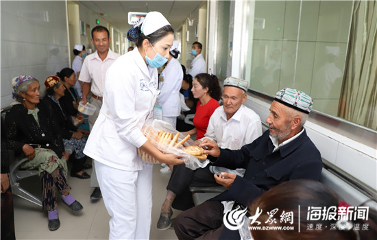 英吉沙縣人民醫(yī)院為等待篩查的患者送上當地特色美食—馕,保障篩查工作安全順利開展。(仇晶 攝)